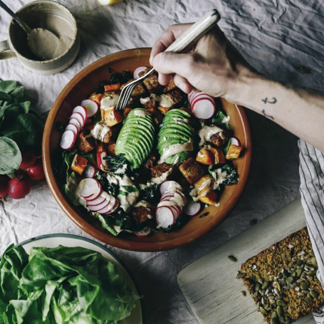 Smagfuld salat med tofu, sød kartoffel og cremet tahindressing.